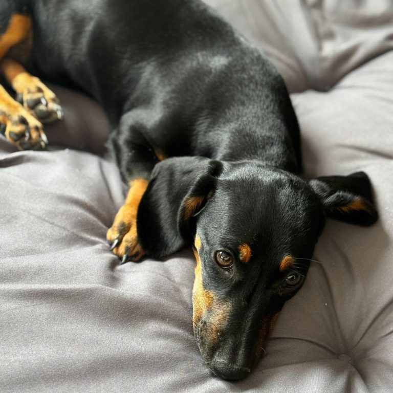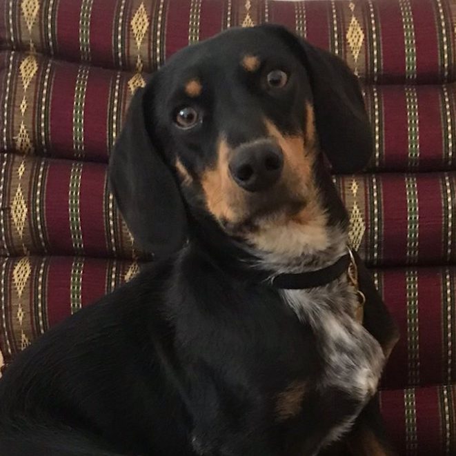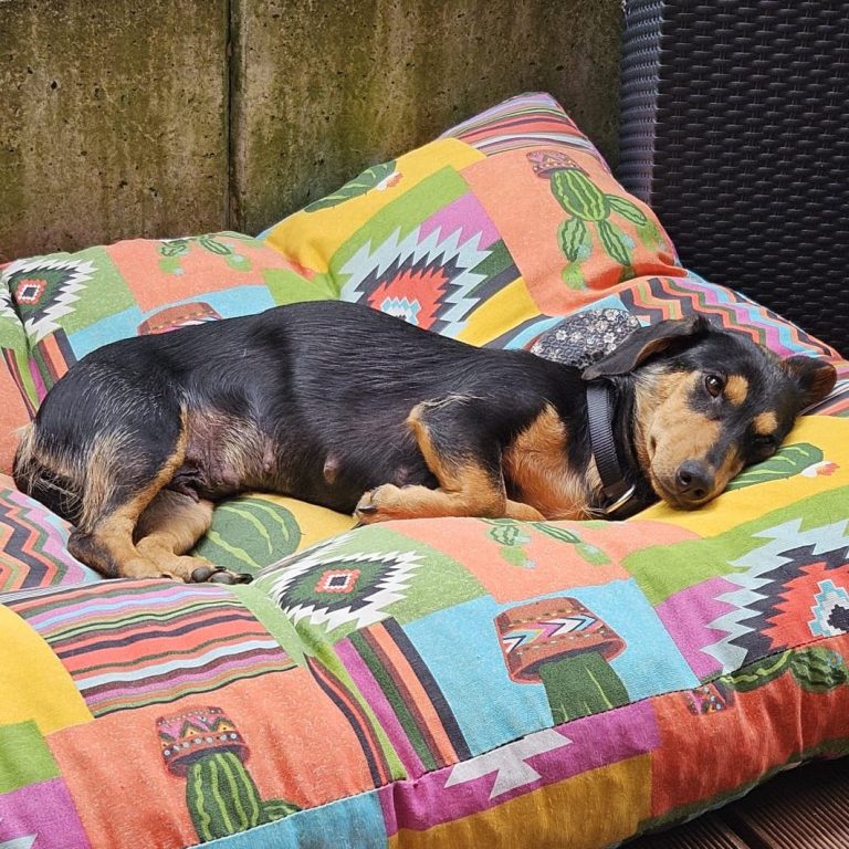 hat jetzt eine Dackelrampe, damit er keine Treppen lauf muss und empfängt Freunde im Garten.