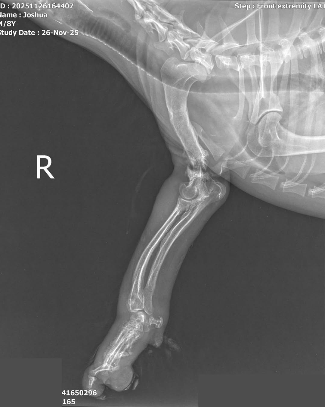 Nach seiner Rettung wurde Joshua geröntgt, und der Tierarzt geht davon aus, dass er in der Vergangenheit einen Autounfall hatte. Sein Bein ist so schwer verletzt, dass wir nach genauer Rücksprache mit dem Tierarzt entscheiden mussten, es zu amputieren. Für Joshua bedeutet dieser Schritt endlich ein Leben ohne Schmerzen.
